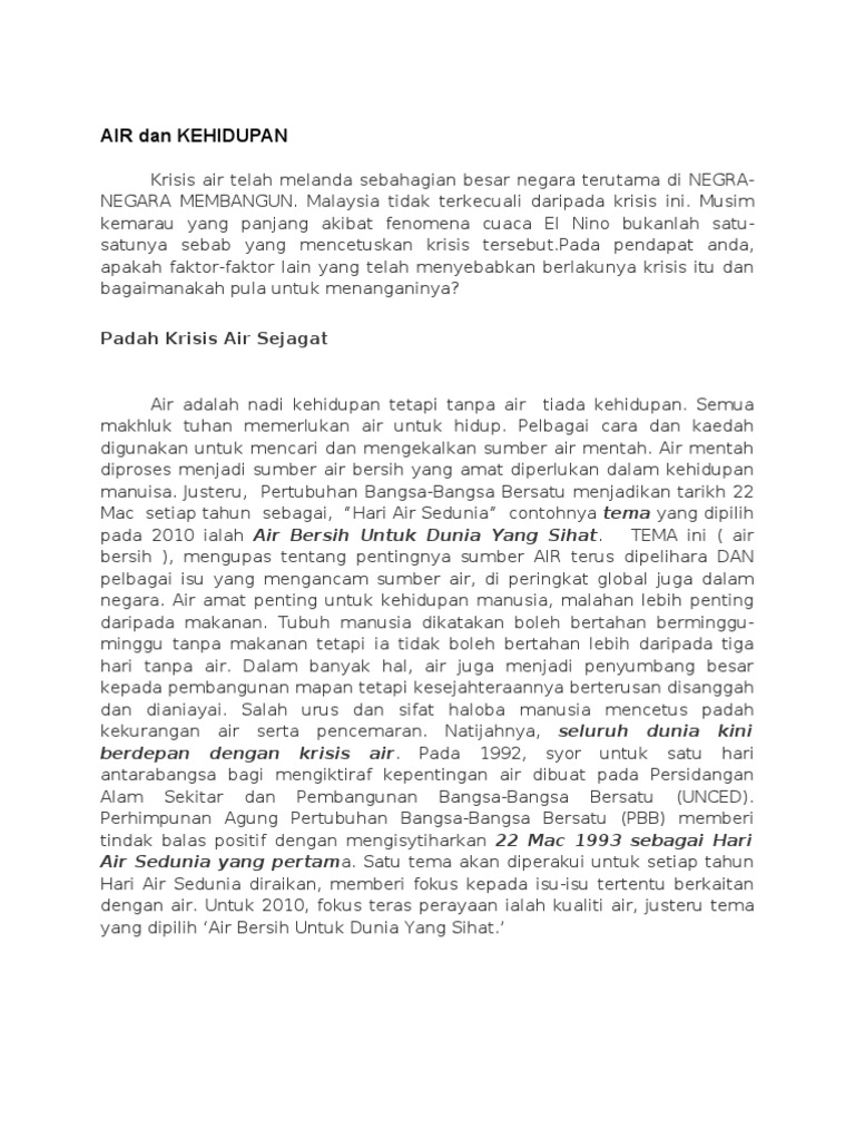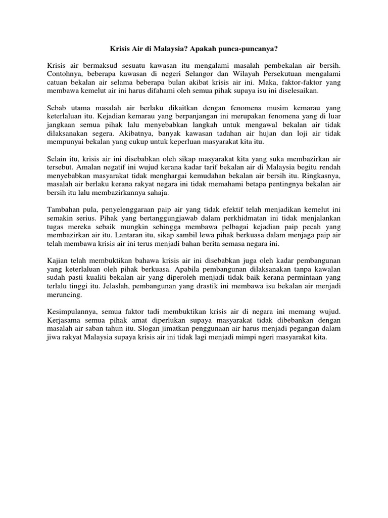 Air adalah sumber kehidupan makhluk di muka bumi, tanpa air tanah akan kering, tidak ada sumber makanan dan matilah semua. Permasalahan krisis air bersih tak hanya terjadi di satu daerah saja namun, beberapa daerah di indonesia. Sebagaimana yang dilansir oleh los angeles times, di somalia, sudan, nigeria, dan yaman, 27 juta 12% orang di dunia kurang pasokan air minum. Manakala baki 3% adalah air bawah tanah. Ia bagi memastikan rizab air di malaysia mencukupi dan mampu menampung keperluan rakyat. Bulan februari 1998 apabila tiga empangan air di lembah kelang iaitu empangan klang. Konsep kelangkaan air ini merujuk pada perolehan sumber air bersih dan memburuk serta menipisnya sumber air yang tersedia. Kekurangan bekalan air bersihbekalan air bersih terpaksa dicatu apabila berlaku krisis air.kekurangan bekalan air juga akan menyukarkan kegiatan harian penduduk dan menganggu sektor. Ini terjadi di negara bagian selangor. Aspek utama krisis air adalah. Sungai di malaysia banyak tercemar akibat daripada sampah dan sisa industri. 100%(5)100% found this document useful (5 votes). Punca krisis air di malaysia.